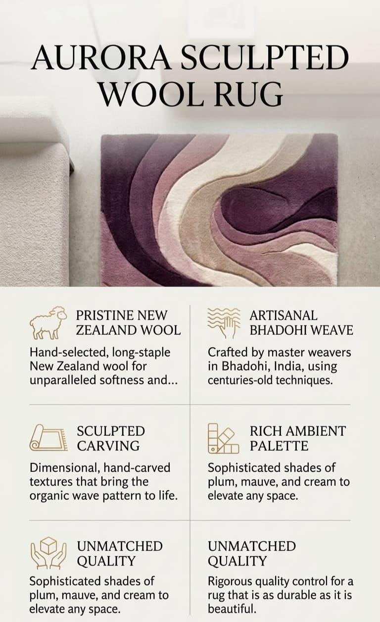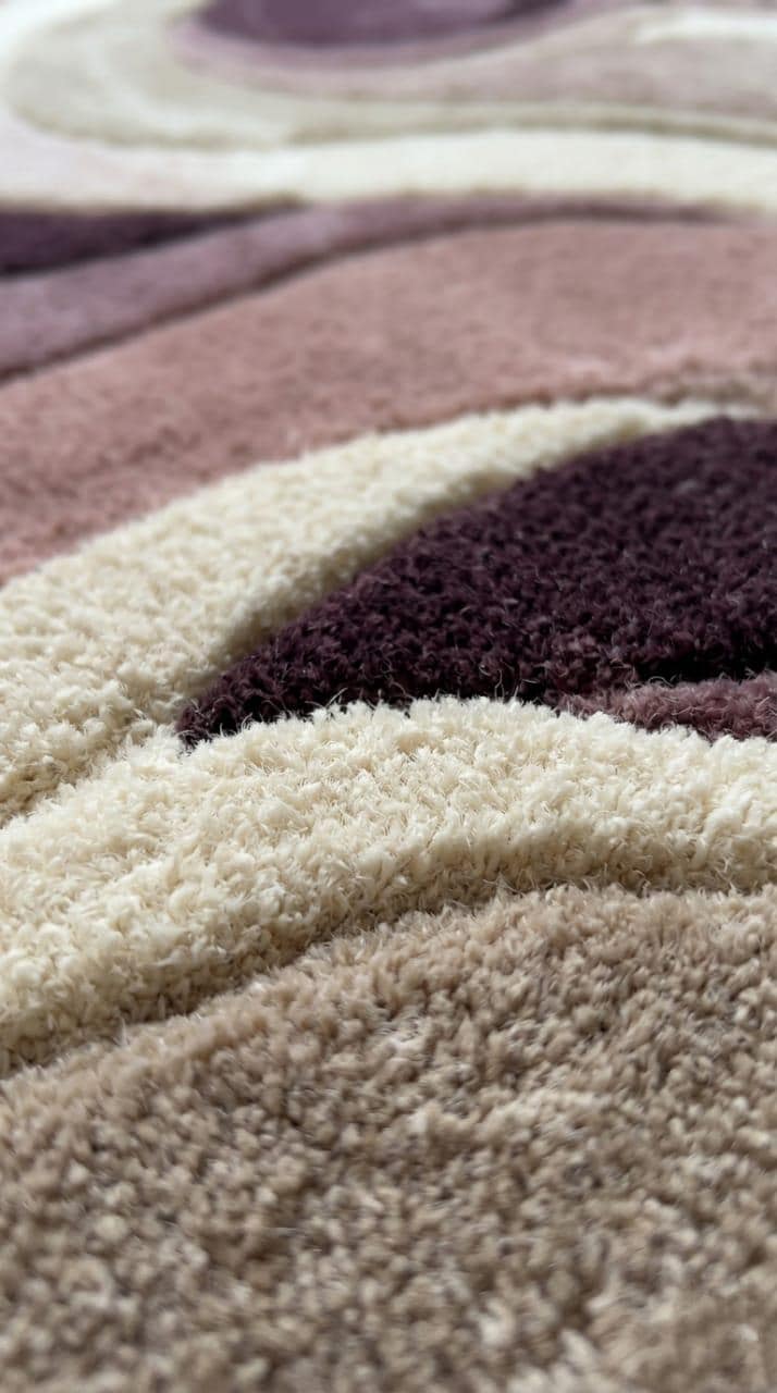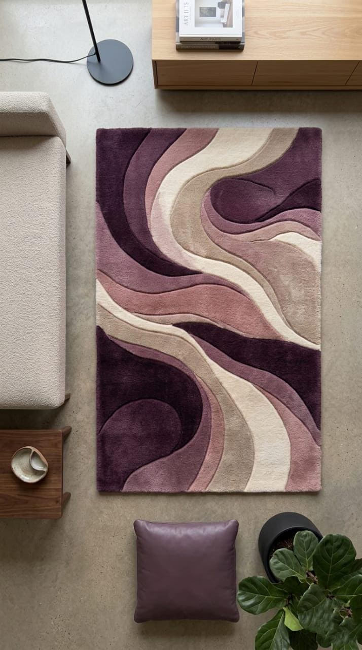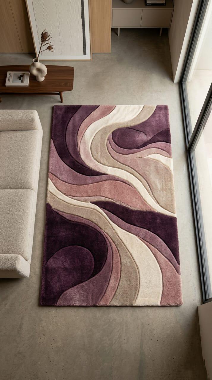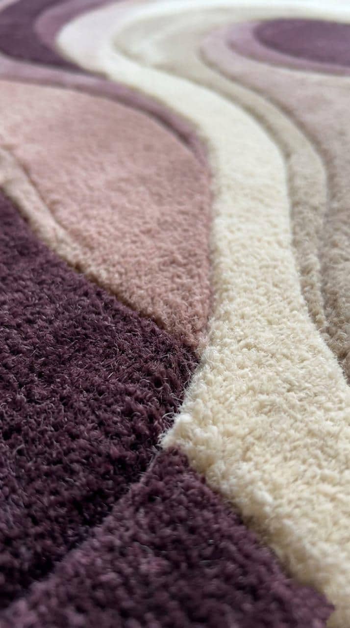 ​Redefine your living space with the Aurora Sculpted Wool Rug. Inspired by the fluid motion of natural tides, this piece is more than just a floor covering—it is "walkable art." The sophisticated gradient of plum, mauve, and cream creates a calming yet bold centerpiece that anchors any room with effortless elegance. Whether it’s under your dining table or in a cozy reading nook, the Aurora rug brings a sense of designer luxury to your everyday life.